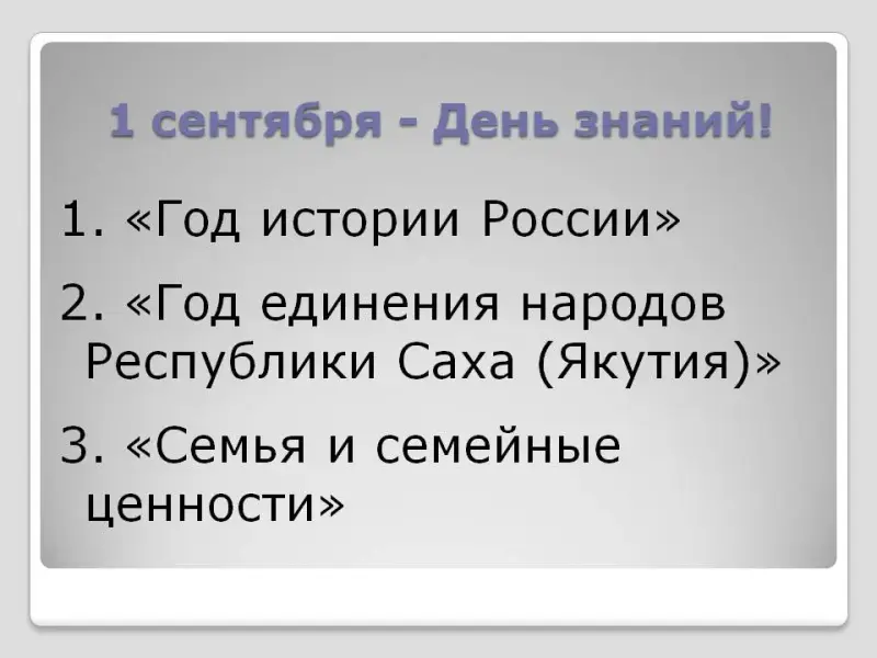 - Добрый день! Вот мы снова с вами и встретились. Все вместе и девочки, и мальчики! Как вы за лето подросли, окрепли. Какие взгляды у вас стали серьёзные, взрослые. Самое время поговорить на взрослую тему. Сегодня, так же как и у нас, во всех школах России 1 сентября - День знаний.