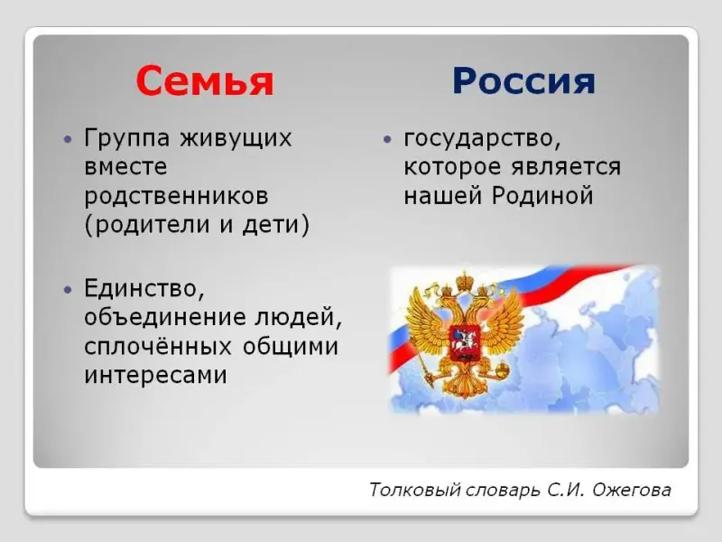 (Дети предполагают, учитель спрашивает многих и останавливается на варианте, когда услышит пару слов: семья и Россия. В моём классе умный мальчишка назвал эти 2 слова сразу, не пришлось выбирать из разных вариантов)