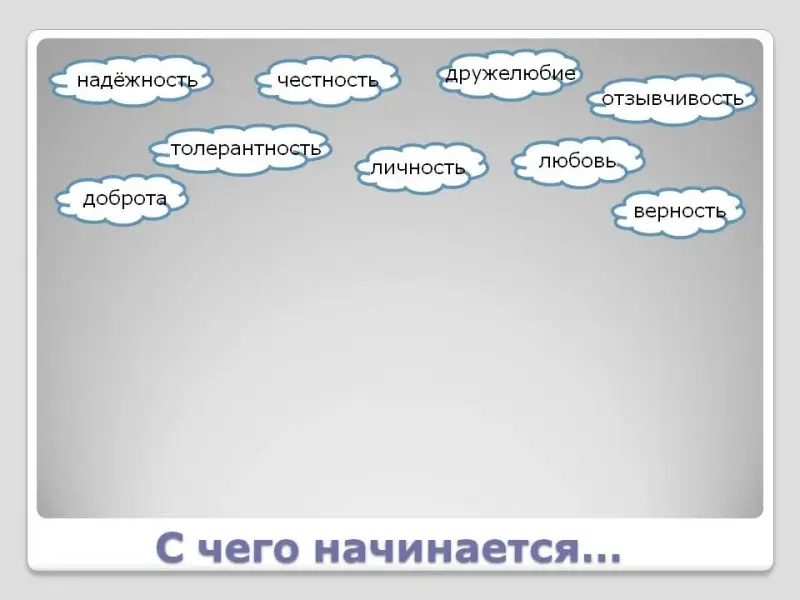 (Здесь и далее курсивом выделен комментарий учителя по проведению классного часа либо ответы детей, которые учитель обобщает. Я провела урок в рамках 1 сентября, но он может быть и самостоятельной воспитательной единицей, так как затрагиваются актуальные нравственные понятия. Если есть возможность использовать интерактивную доску, тогда можно воспользоваться Презентацией.Если такой возможности нет, лучше использовать обычную классную доску и карточки с толкованием слов (Приложение 1) распределять на доске последовательно, согласно логике урока.)