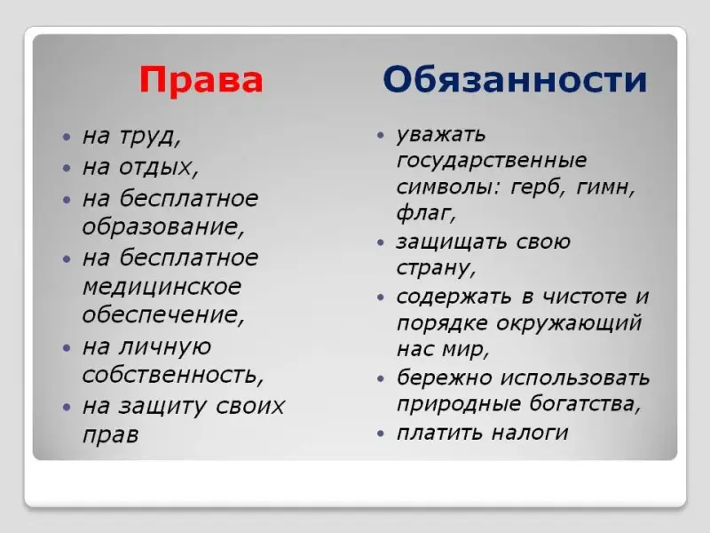 - Но при этом у каждой личности есть и обязанности перед своей семьёй, государством. Напомните, какие? (Уважать государственные символы: герб, гимн, флаг. Уважать президента, старших. Защищать свою страну, содержать в чистоте и порядке окружающий нас мир, бережно использовать природные богатства. Платить налоги).