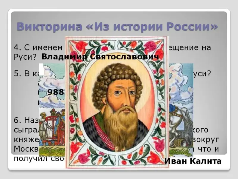 4. С именем какого князя связано крещение на Руси? (Владимир Святославович)