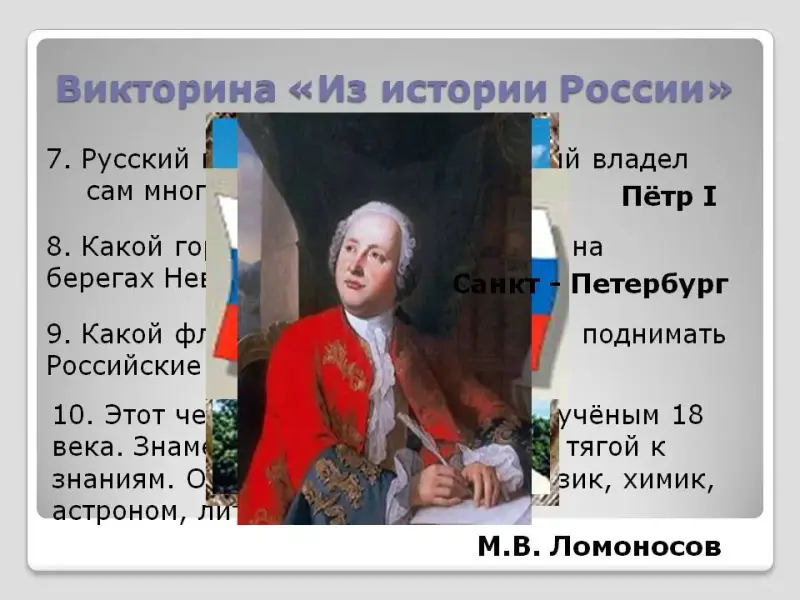 10. Этот человек стал выдающимся учёным 18 века. Знаменит своей удивительной тягой к знаниям. Он художник, историк, физик, химик, астроном, литератор? (Михаил Васильевич Ломоносов)