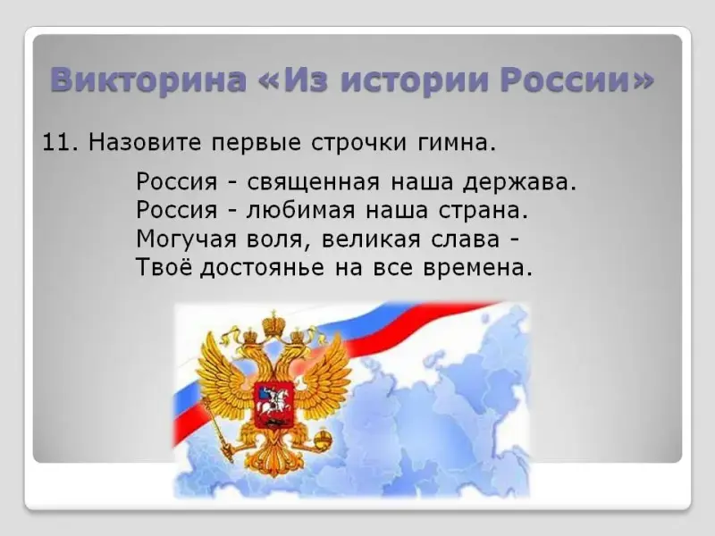 11. Назовите первые 2 строчки гимна. (Россия - священная наша держава. Россия - любимая наша страна).