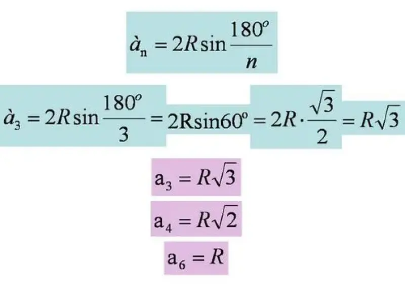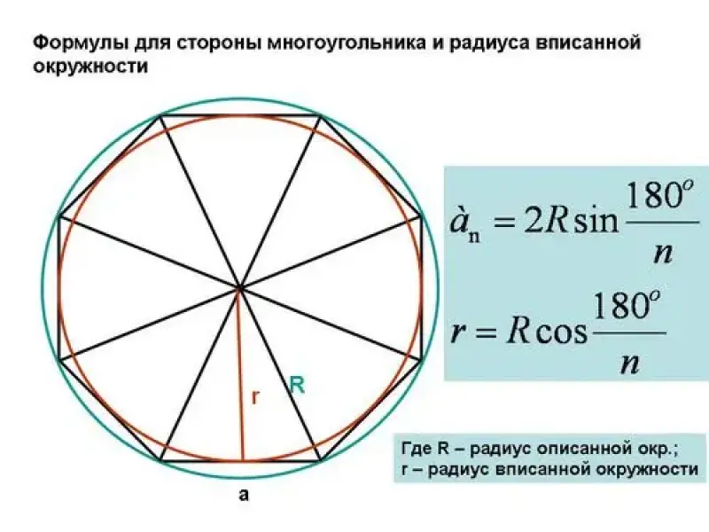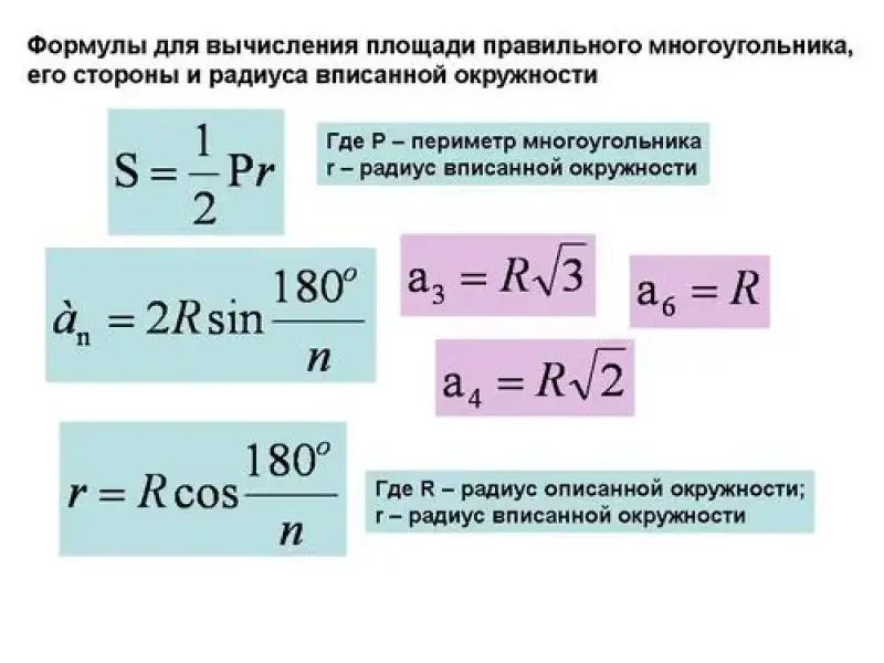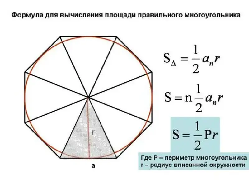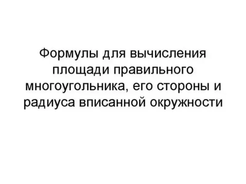 - Формулы для вычисления площади правильного многоугольника, его стороны и радиуса вписанной окружности. Презентация 8.