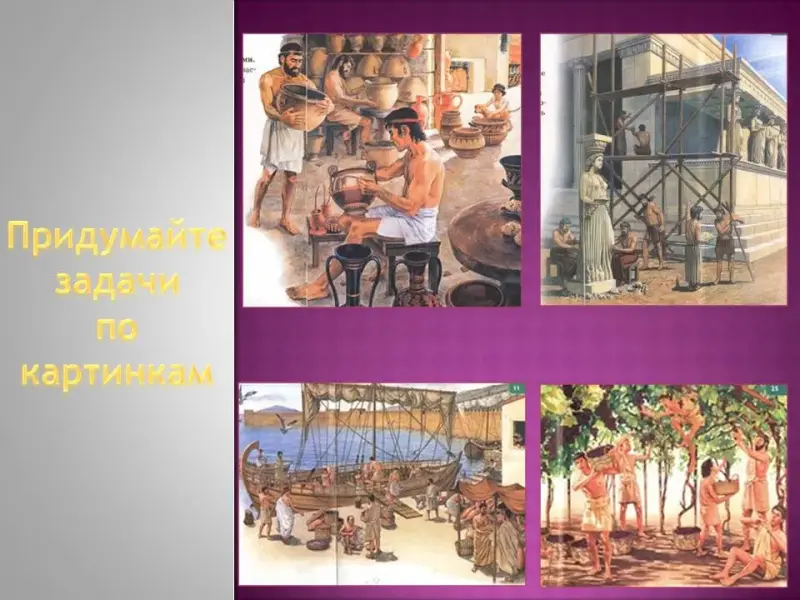 Перед вами картинки из жизни древних греков - придумайте задачи на их основе. Затем команды обмениваются задачами и решают их, за интересные и грамотно составленные задачи получают баллы (5