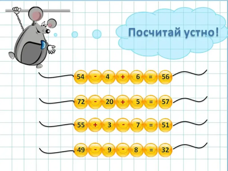 Учитель. Первое задание устного счета вам предлагает Мышка, а Смайлик будет ей помогать.