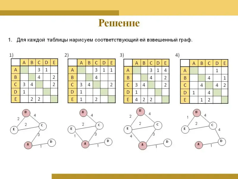 Если для каждого ребра указано направление, граф называют ориентированным (или орграфом). Ребра орграфа называют дугами. Его матрица смежности не всегда симметричная. Единица, стоящая на пересечении строки A и столбца B, говорит о том, что существует дуга из вершины A в вершину B: (слайд 6). Часто с каждым ребром связывают некоторое число - вес ребра. Это может быть, например, расстояние между городами или стоимость проезда. Такой граф называется взвешенным. Информация о таком графе хранится в виде весовой матрицы, содержащей веса ребер: (слайд 7). У взвешенного орграфа весовая матрица не всегда симметрична относительно главной диагонали: (слайд 8). Если связи между двумя узлами нет, на бумаге можно оставить ячейку таблицы пустой, а при хранении в памяти компьютера записывать в нее условный код, например, 0, -1 или очень большое число (?), в зависимости от задачи. Другим примером ориентированного графа являются блок-схемы алгоритмов. (слайд 9) Блок-схема алгоритма представляет собой граф процесса управления некоторым исполнителем. Блоки - вершины этого графа - обозначают отдельные команды, которые отдаются исполнителю, а дуги указывают на последовательность переходов от одной команды к другой. |