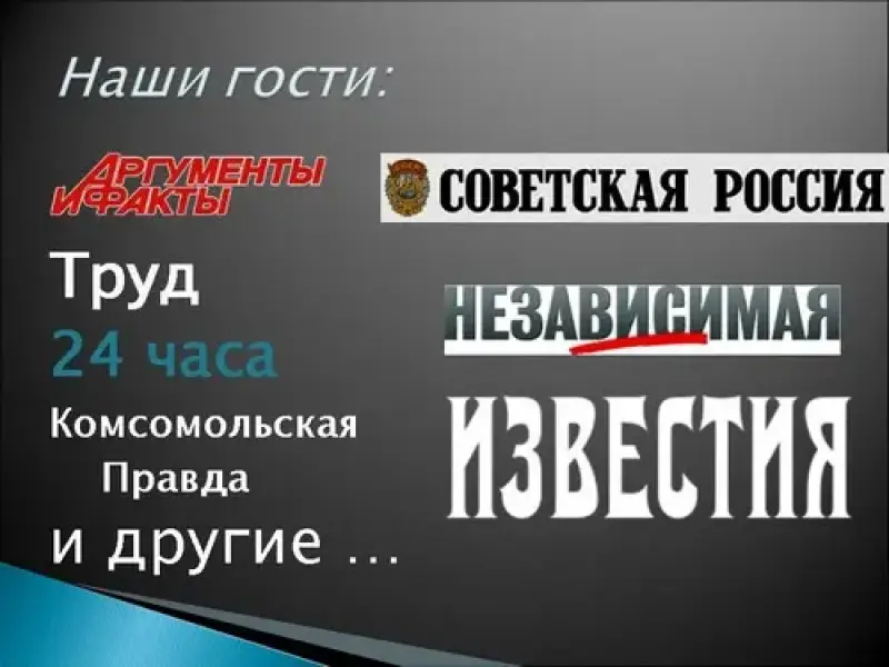 Учащиеся рассаживаются за парты, на которых таблички с названиями газет и журналов: "24 часа", "Аргументы и факты" и другие.
