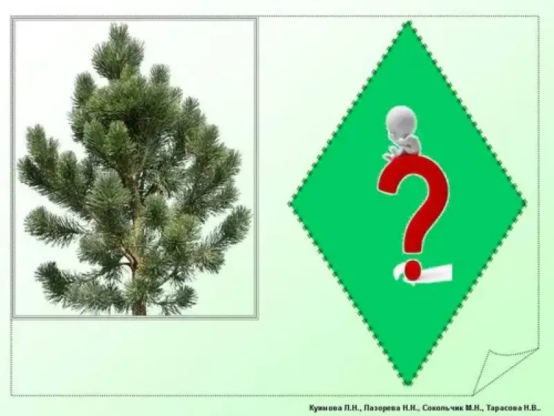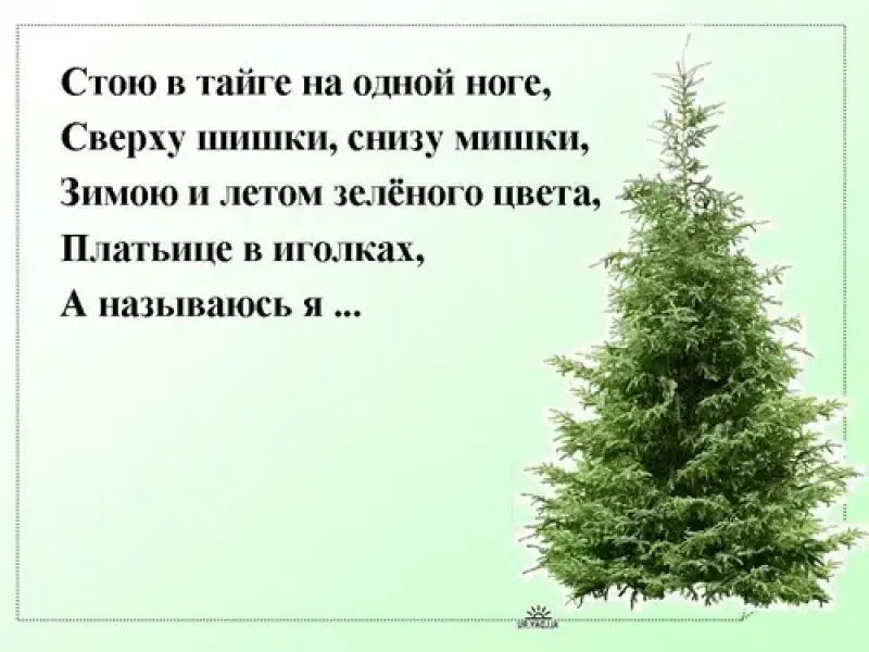 - Что вы можете рассказать про ёлку? (хвойное дерево, зеленого цвета, колючая, на ней есть шишки...)