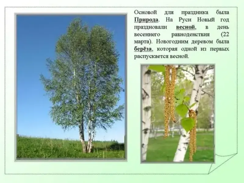 На Руси Новый год праздновали весной, в день весеннего равноденствия - начало возрождения Природы. Новогодним деревом была береза (древо жизни и любви). Береза первой распускается весной и является сосредоточением животворящих сил, отпугивает зло и приносит здоровье. После крещения Руси Новый год стали встречать 1 марта по юлианскому календарю.