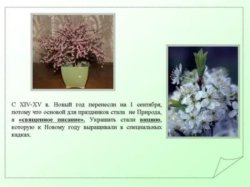 С распространением христианства основой для праздника стали не природа и сельское хозяйство, а "священное писание", поэтому с 14-15 века новый год перенесли на 1 сентября. Называлось это православное новолетие. Считается, что стали украшать вишню, которую к Новому году выращивали в специальных кадках.