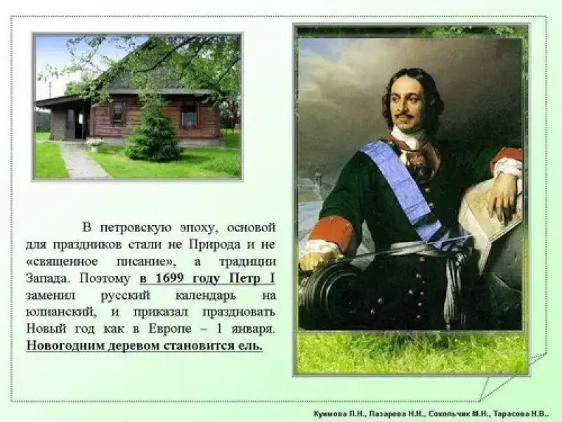 А в эпоху Петра I основой для праздника стали не Природа и "священное писание", а традиции Запада. Петр I приказал праздновать Новый год, как в Европе, 1 января. Новогодним деревом становится ель.