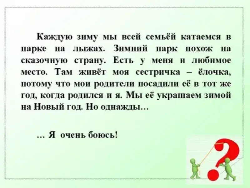 "Каждую зиму мы всей семьей катаемся в парке на лыжах. Зимний парк похож на Сказочную страну. Есть у меня и любимое место. Там живет моя сестричка - елочка, потому что мои родители посадили ее в тот же год, когда родился и я. Мы ее украшаем зимой на Новый год. Но однажды...