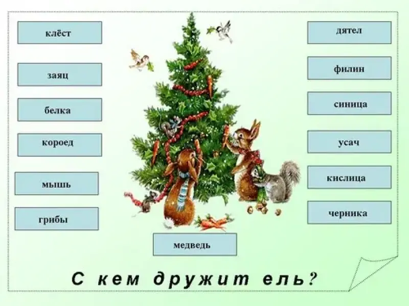 - Заполните схему "С кем дружит ель?", используя увиденную инсценировку и дополните своими примерами.