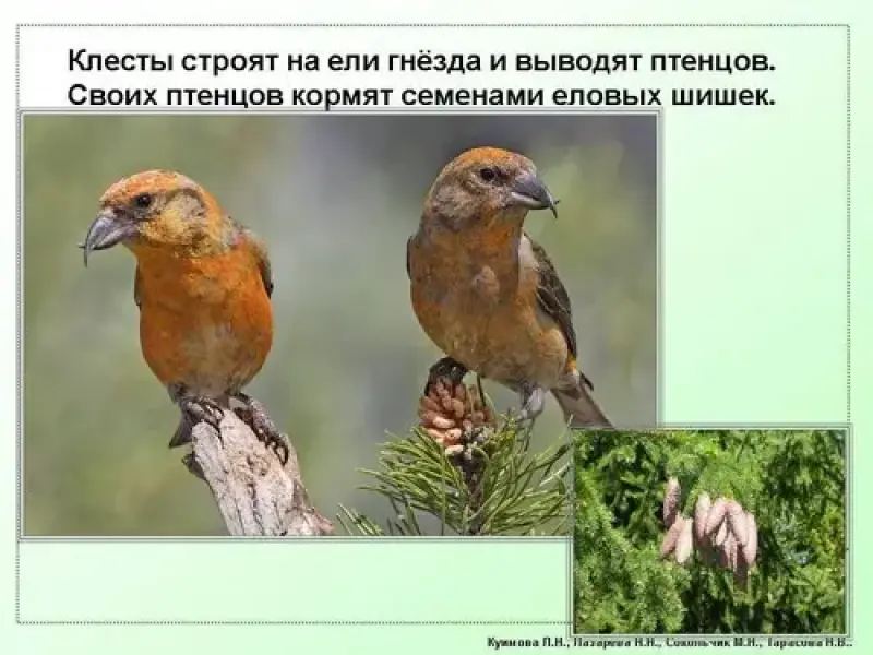 - Мы клесты выводим своих птенцов зимой и кормим их семенами еловых шишек. А гнездо мое расположено здесь, на этой самой ели, возле ствола.