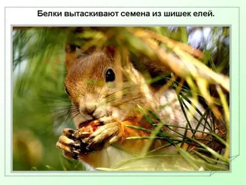 - Не руби нашу елочку!- зацокола белка. - В голодные годы мы питаемся еловыми шишкам и молодыми побегами ели, а еще среди ветвей в дуплах еловых деревьев мы строим свои гнезда - гайно. Нам не прожить без ели!