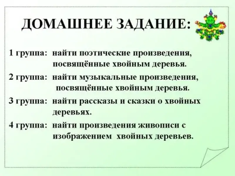- На уроке окружающего мира группам даны были творческие задания найти в литературе, музыке и живописи изображения хвойных деревьев.
