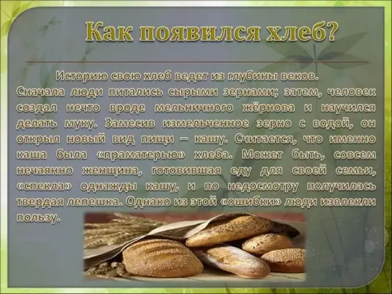 Историю свою хлеб ведет из глубины веков. Сначала люди питались сырыми зернами; затем, приспособив два камня, человек создал нечто вроде мельничного жёрнова и научился делать муку. Замесив измельченное зерно с водой, он открыл новый вид пищи - кашу. Считается, что именно каша была "праматерью" хлеба. Открытие огня позволило человеку усовершенствовать свою пищу. Может быть, совсем нечаянно женщина, готовившая еду для своей семьи, "спекла" однажды кашу, и по недосмотру получилась твердая лепешка. Однако из этой "ошибки" люди извлекли пользу. Лепешки оказались лучше и удобнее каши. Вначале лепешки ели в горячем виде в качестве приправы к мясу, потом стали употреблять в пищу и холодными. А холодная лепешка была уже хлебом! К тому же ее можно было брать с собою на охоту.