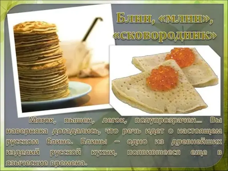 Предтечей современного блина был овсяный кисель, который кто-то решил подогреть на огне. Человек этот, видимо, зазевался, кисельная гуща поджарилась, подрумянилась, и получился готовый блин - он же первый хлеб, лепешка. На Руси испокон веков пекли блины не только овсяные, но и пшеничные, ржаные, гречневые, гречнево-пшеничные. В русской домашней кухне были очень популярны блины с припеками: луком, мясом, рыбой, грибами, яйцами, в качестве начинки также использовали творог или лесные ягоды. К блинам в русских домах подавали масло, черную и красную икру, малосоленую рыбу, рубленую сельдь, варенье, сметану.
