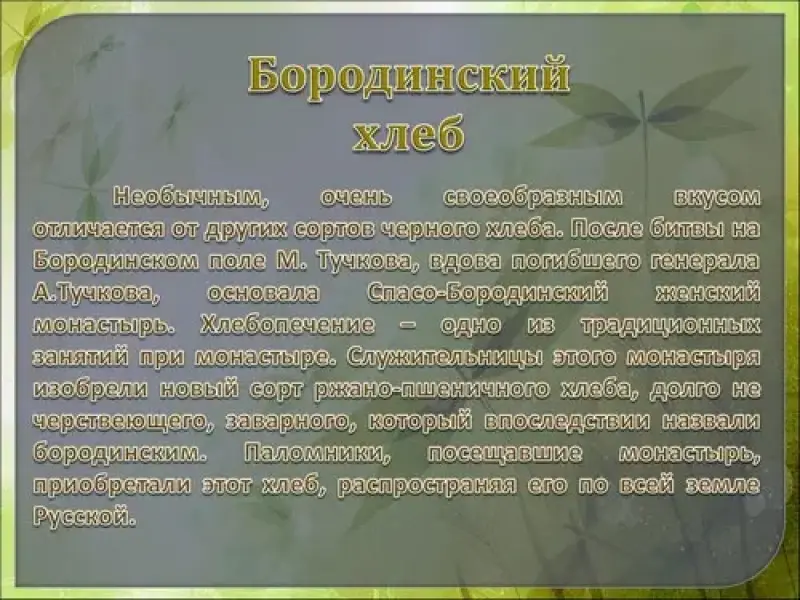 Необычным, очень своеобразным вкусом отличается от других сортов черного хлеба бородинский. А придает ему этот вкус кориандр, замешенный в тесто. Есть в этом хлебе и так нужные нам витамины В1 и В2. Недаром пользуется он повышенным спросом не только на территории современной России, но и в странах бывшего СССР. А еще бытует мнение, что на Руси уже в Средние века появились такие сорта черного хлеба, как заварной, красносельский. Поистине интересна история появления бородинского хлеба. После битвы на Бородинском поле М. Тучкова, вдова погибшего генерала А.Тучкова, основала Спасо-Бородинский женский монастырь. Хлебопечение - одно из традиционных занятий при монастыре. Служительницы этого монастыря изобрели новый сорт ржано-пшеничного хлеба, долго не черствеющего, заварного, который впоследствии назвали бородинским. Паломники, посещавшие монастырь, приобретали этот хлеб, распространяя его по всей земле Русской. Сейчас на хлебозаводах существует своя рецептура приготовления и выпечки этого хлеба, сохраняющая многовековые традиции.