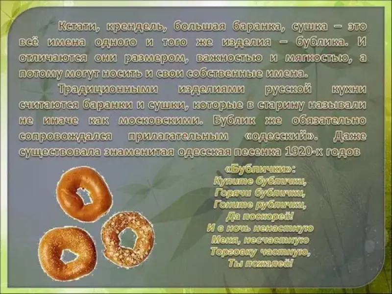 Оказывается, традиционными изделиями русской кухни считаются баранки и сушки, которые в старину называли не иначе как московскими. Бублик же обязательно сопровождался прилагательным "одесский". Даже существовала знаменитая одесская песенка 1920-х годов "Бублички":