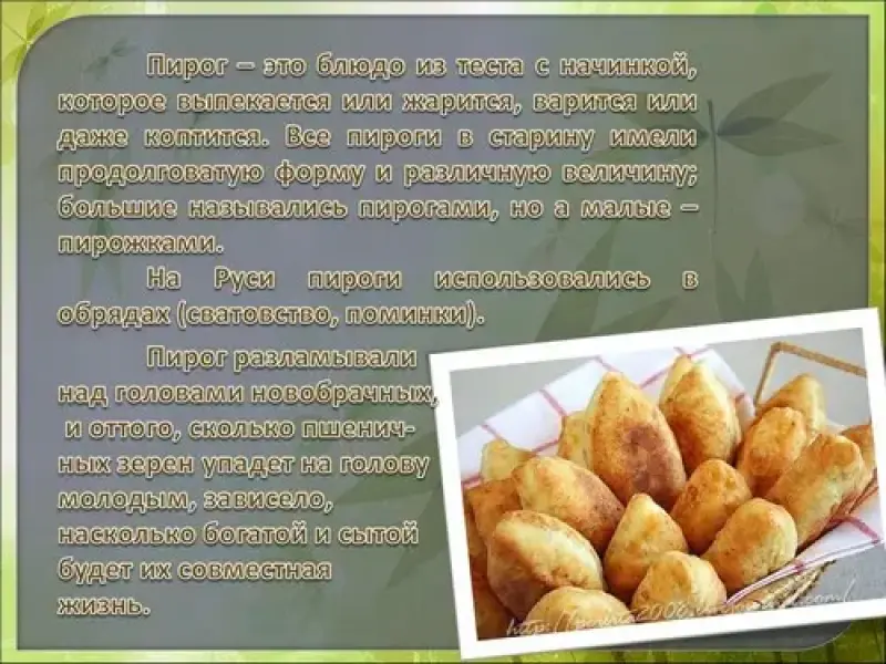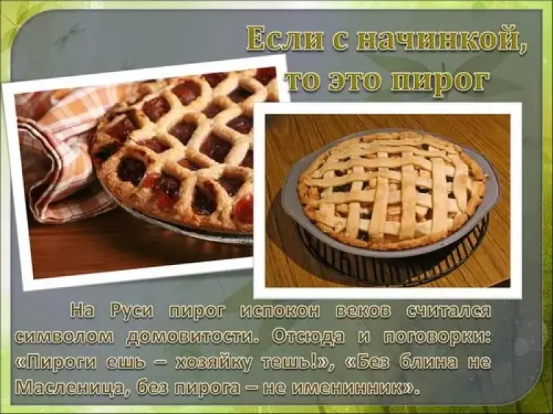 На Руси пирог испокон веков считался символом домовитости. Отсюда и поговорки: "Пироги ешь - хозяйку тешь!", "Без блина не Масленица, без пирога - не именинник". Некоторые пироги использовались в обрядах (сватовство, поминки). Ни один русский свадебный стол не обходился без курника - закрытого пирога, по форме напоминающего купол. Именно с курником связан ритуал разламывания хлеба. Пирог разламывали над головами новобрачных, и оттого, сколько пшеничных зерен упадет на голову молодым, зависело, насколько богатой и сытой будет их совместная жизнь. На следующий день после свадьбы молодая жена должна была испечь пирог. Этим пирогом она потчевала гостей, и по его вкусу судили о домовитости будущей хозяйки.