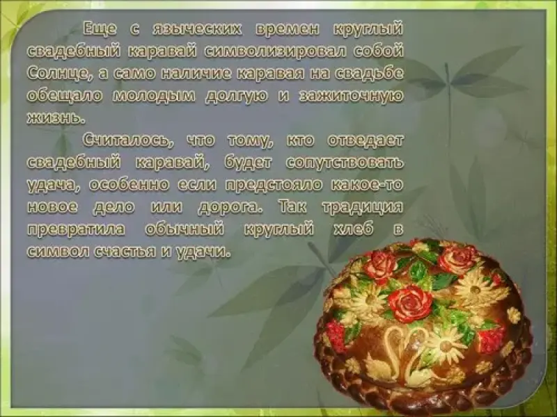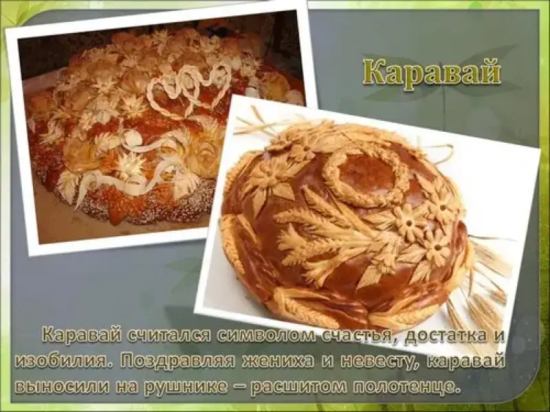 Традиция выпекать на свадьбу праздничный обрядовый хлеб присуща всем славянским народам. На русских свадьбах - это каравай, у белорусов и украинцев также существует каравайные традиции. Свадебные караваи украшались сложными тестяными узорами, иногда живыми колосьями и веточками калины. Колосья пшеницы символизировали изобилие, достаток, листья или гроздь калины - любовь, прибавление в семье. У татар готовят на свадьбу пирог из слоеного теста - губадию. Название иное, а обрядовое значение такое же.