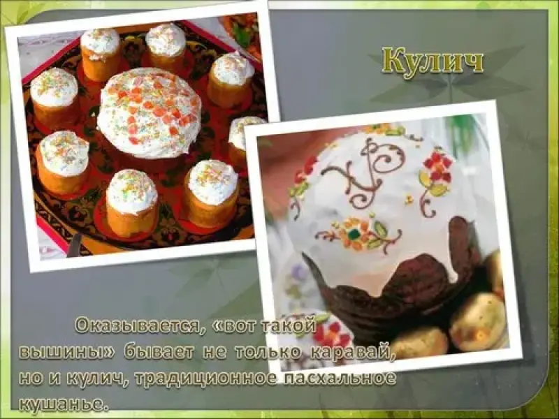 Чтобы кулич как можно больше проходил на церковный артос, его выпекают в форме цилиндра. И хотя во всех куличах используется дрожжевое тесто, от количества сдобы зависит, насколько он будет высок и пышен. Куличи часто выпекают с изюмом, а сверху украшают сахарной пудрой или глазурью.