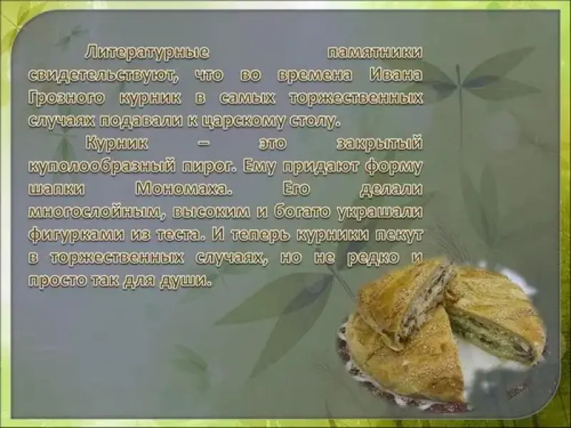Курник - это закрытый куполообразный пирог. Ему придают форму шапки Мономаха. Раньше в народном быту курники делали только из пресного сдобного теста, поскольку при выпечке оно хорошо сохраняет рисунок. Некоторые этот пирог готовят из двух видов теста - сдобного и слоеного. Начинку в курнике принято делать в несколько слоев: из припущенного риса, заправленного маслом, с добавлением рубленных яиц, порезанной мелкими кусочками отварной курицы с густым молочным соусом (отсюда и название птичье - курник), жаренных грибов, опять курицы и снова риса. Каждый слой перекладывали блинчиками. Строили курник так: готовили две лепешки из теста, причем одна должна быть меньше другой почти вдвое. Маленькую лепешку клали на сковороду на ней расстилали блинчиками и укладывали слои начинки. На большой лепешке от краев к центру делали 8 надрезов - этой лепешкой закрывали начинку, защипывая по разрезам и в местах соединения с нижней лепешкой. Все это сооружение украшали орнаментом из теста, смазывали яйцом и выпекали в русской печи.