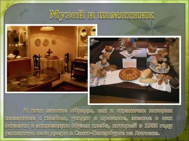 Чем больше мы узнаем о хлебе, тем сильнее убеждаемся, что ничто так не роднит человека с природой как этот продукт. И как бы ни менялась наша жизнь, она по - прежнему немыслима без хлеба и хлебобулочных изделий: в праздники и в будни они всегда с нами, как наша главная поддержка и опора. Недаром испокон веков в честь хлеба слагались гимны, песни, совершались обряды, устраивались праздники, приуроченные к посевной страде и сбору урожая. И хотя многие обряды, как и странички истории связанные с хлебом, уходят в прошлое, знание о них остается не только в памяти народа оно запечатано в экспозиции Музея хлеба, который в 1988 году распахнул свои двери в Санкт-Петербурге на Лиговке. Это единственный в нашей стране и 13-й в мире музей, целиком посвященный не только развитию хлебного дела в России с древнейших времен и до дней нынешних. Хранит он и мудрые традиции, связанные с хлебом. Здесь все проникнуто бережливым, трепетным отношением человека к каждой корочке, к каждой горбушке. В музее собрано более 14000 экспонатов, отображающих быт, уклад жизни наших предков, а также многообразный ассортимент, все изменения и преобразования, связанные с выпечкой хлеба на протяжении веков. В одном из залов воссоздана небольшая петербургская пекарня, оснащенная всем необходимым оборудованием для производства хлеба и торговли им.