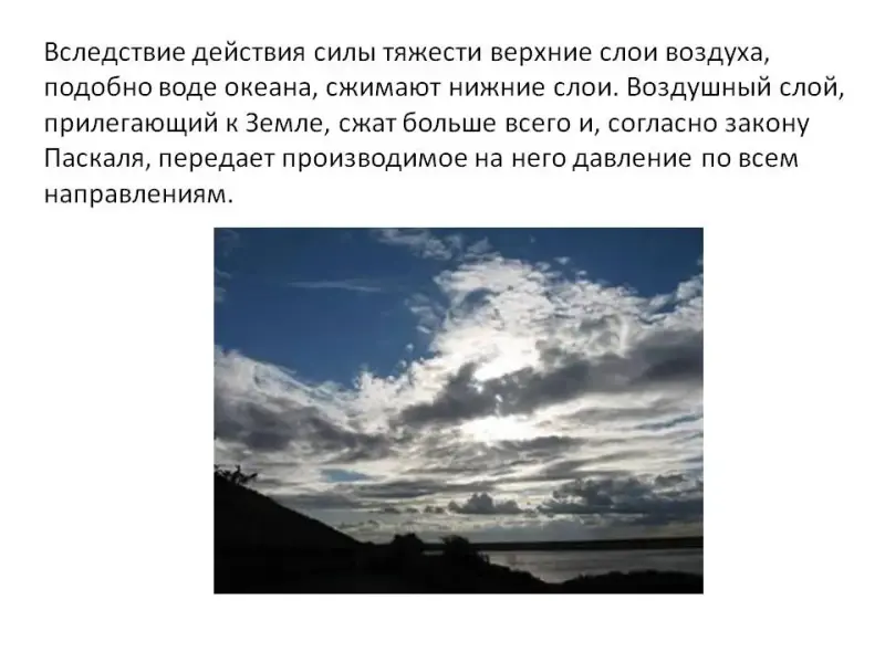 Записать в тетради: вследствие действия силы тяжести верхние слои воздуха, подобно воде океана, сжимают нижние слои. Воздушный слой, прилегающий к Земле, сжат больше всего и, согласно закону Паскаля, передает производимое на него давление по всем направлениям.[1]