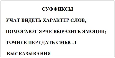 - Уточнять представление учащихся о суффиксе как части основы слова, которая может придать слову оттенки значений или образовывать слово с новым значением, развивать память, орфографическую зоркость.