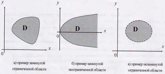 Область определения называется замкнутой областью, если она включает в себя свою границу; открытой областью, если она не включает в себя свою границу; ограниченной областью, если может быть помещена в круг конечного радиуса.