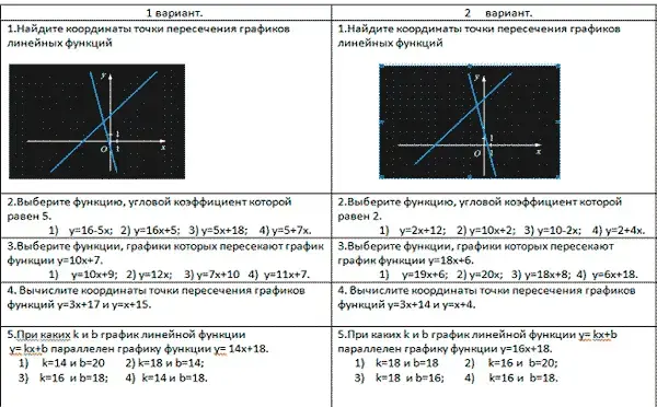 - обучающие: знакомство обучающихся с понятием углового коэффициента, условиями пересечения и параллельности графиков линейных функций, нахождением точек пересечения графиков функций аналитическим и графическим способами;
