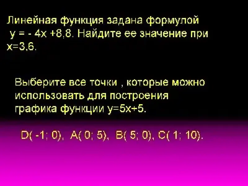 5. Линейная функция задана формулой у = - 4х +8,8. Найдите ее значение при х=3,6.