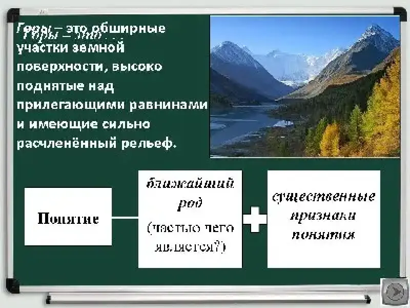 Организовывает работу над определением понятия "горы" (в зависимости от уровня подготовки класса). (Слайд 3)