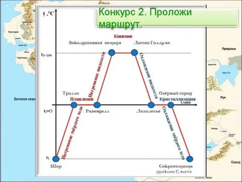 Ответы: Шир-Тролли (Нагревание твёрдого тела), Тролли - Ривенделл (Плавление), Ривенделл - Заколдованная пещера (Нагревание жидкости), Заколдованная пещера - Логово Голлума (Кипение), Логово Голлума - Лихолесье (Охлаждение жидкости), Лихолесье - Озёрный город (Кристаллизация), Озёрный город - Сокровища дракона Смогга (Охлаждение твёрдого тела).