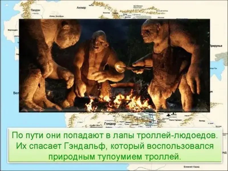 Пятнадцать путников (то есть гномы, Бильбо и Гэндальф) отправляются в трудное путешествие. По пути они попадают в лапы троллей-людоедов. Их спасает Гэндальф, который воспользовался природным тупоумием троллей. Тролли не смогли до рассвета разгадать кроссворд, составленный Гэндальфом. Восходящее Солнце превратило их в камень.
