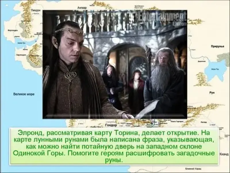 После этого приключения путешественники добрались в Ривенделл, дом и крепость Элронда, предводителя эльфов и людей Севера. Элронд, рассматривая карту Торина, делает открытие. На карте лунными рунами была написана фраза, указывающая, как можно найти потайную дверь на западном склоне Одинокой Горы. Помогите героям расшифровать загадочные руны.