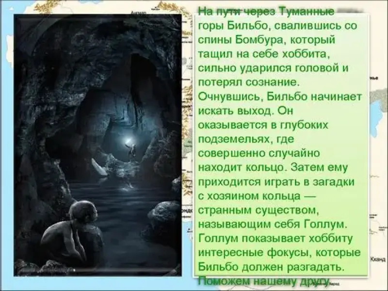 На пути через Туманные горы Бильбо, свалившись со спины Бомбура, который тащил на себе хоббита, сильно ударился головой и потерял сознание. Очнувшись, Бильбо начинает искать выход. Он оказывается в глубоких подземельях, где совершенно случайно находит кольцо. Затем ему приходится играть в загадки с хозяином кольца - странным существом, называющим себя Голлум. Голлум показывает хоббиту интересные фокусы, которые Бильбо должен разгадать.