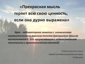 Урок-лабораторное занятие с элементами лингвистического анализа текста "Прекрасная мысль теряет всю свою ценность, если она дурно выражена" (раскрытие смысла высказывания и его аргументация с лексическими и грамматическими явлениями)