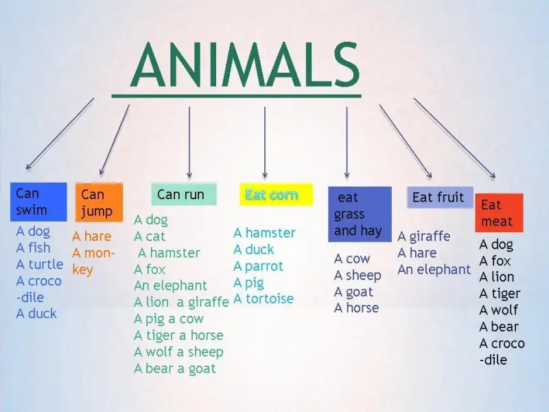 A crocodile,a fish ...can swim/. A hare,a monkey can jump. A hare, an elephant...don't eat meat. Fox, wolf...