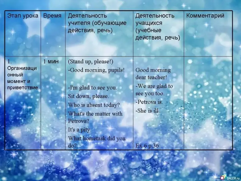 -Good morning, pupils! -I'm glad to see you. Sit down, please. Who is absent today? What's the matter with Petrova? It's a pity. What hometask did you do? |