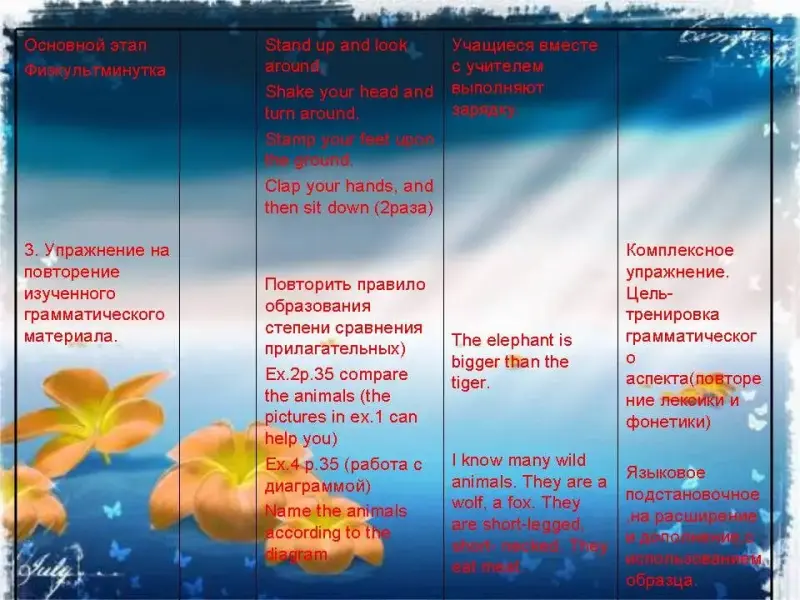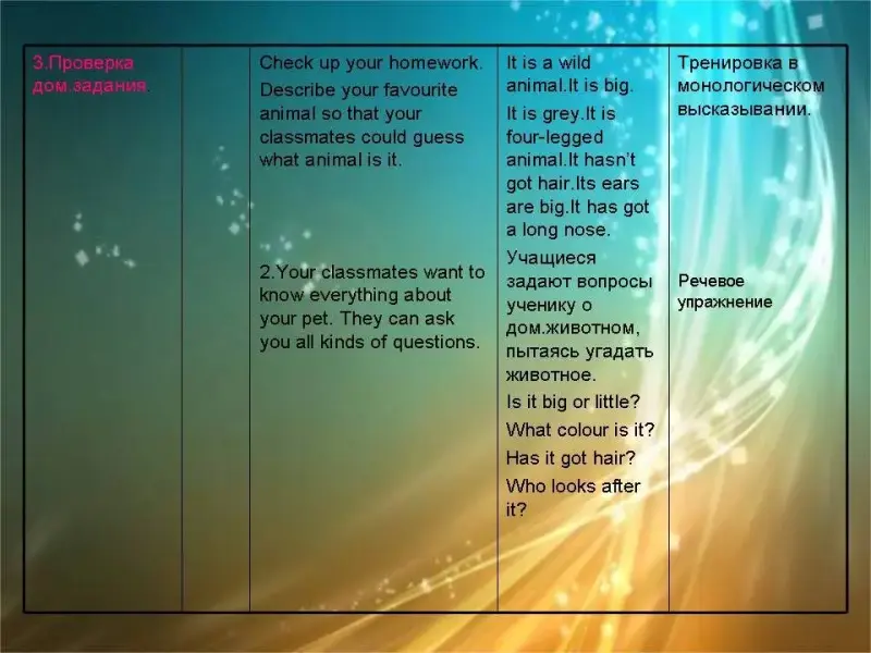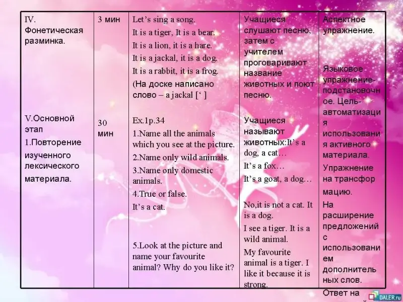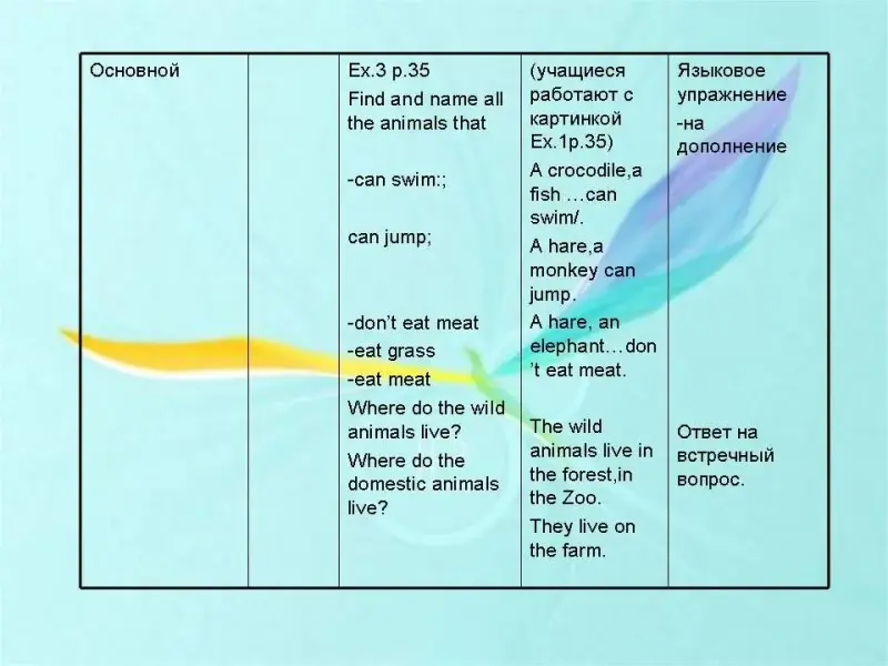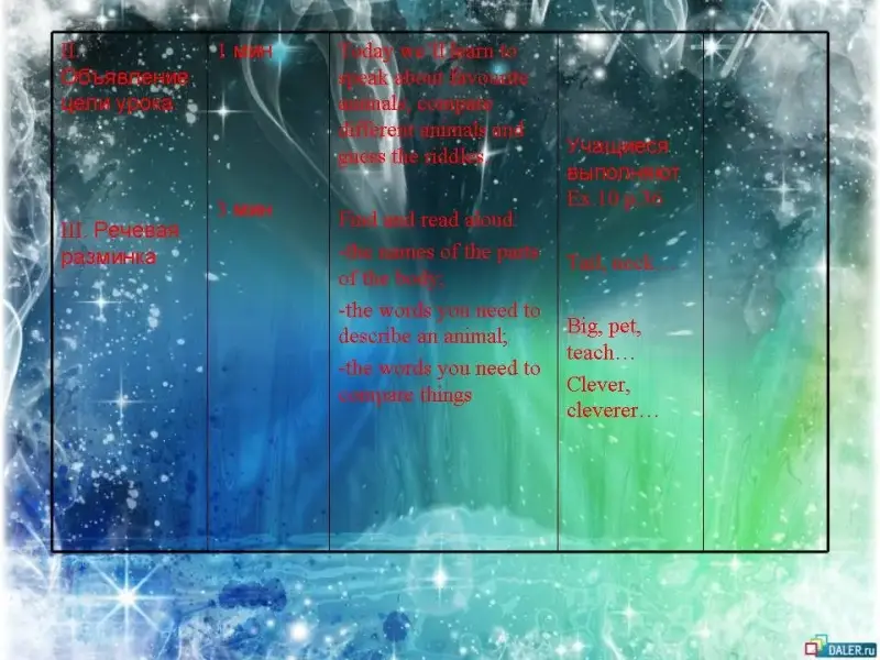 | II. Объявление цели урока. | 1 мин | Today we'll learn to speak about favourite animals, compare different animals and guess the riddles. | Учащиеся выполняют Ex.10 p.36 | |