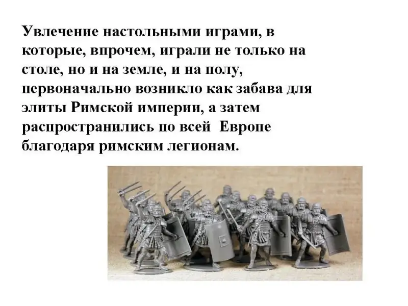 Увлечение настольными играми, в которые, впрочем, играли не только на столе, но и на земле, и на полу, первоначально возникло как забава для элиты Римской империи, а затем распространились по всей Европе благодаря римским легионам.