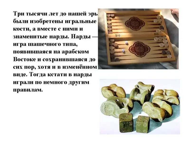 Три тысячи лет до нашей эры были изобретены игральные кости, а вместе с ними и знаменитые нарды. Нарды - игра шашечного типа, появившаяся на арабском Востоке и сохранившаяся до сих пор, хотя и в изменённом виде. Тогда кстати в нарды играли по немного другим правилам.
