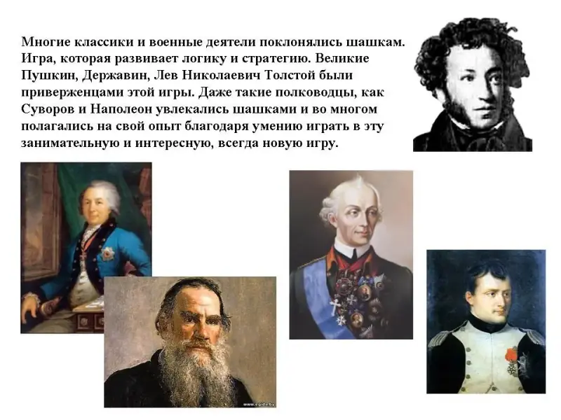 Многие классики и военные деятели поклонялись шашкам. Игра, которая развивает логику и стратегию. Великие Пушкин, Державин, Лев Николаевич Толстой были приверженцами этой игры. Даже такие полководцы, как Суворов и Наполеон увлекались шашками и во многом полагались на свой опыт благодаря умению играть в эту занимательную и интересную, всегда новую игру.