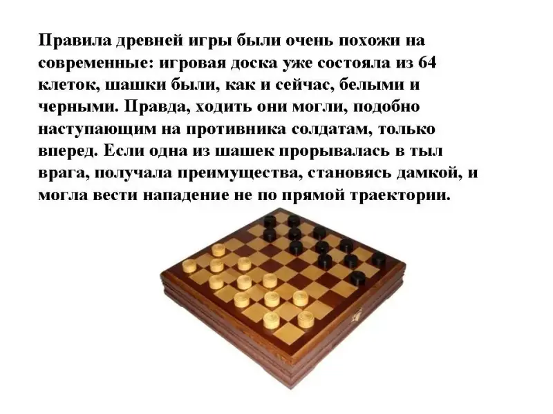 Правила древней игры были очень похожи на современные: игровая доска уже состояла из 64 клеток, шашки были, как и сейчас, белыми и черными. Правда, ходить они могли, подобно наступающим на противника солдатам, только вперед. Если одна из шашек прорывалась в тыл врага, получала преимущества, становясь дамкой, и могла вести нападение не по прямой траектории.