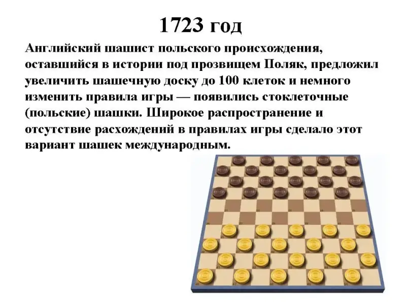 Английский шашист польского происхождения, оставшийся в истории под прозвищем Поляк, предложил увеличить шашечную доску до 100 клеток и немного изменить правила игры - появились стоклеточные (польские) шашки. Широкое распространение и отсутствие расхождений в правилах игры сделало этот вариант шашек международным.