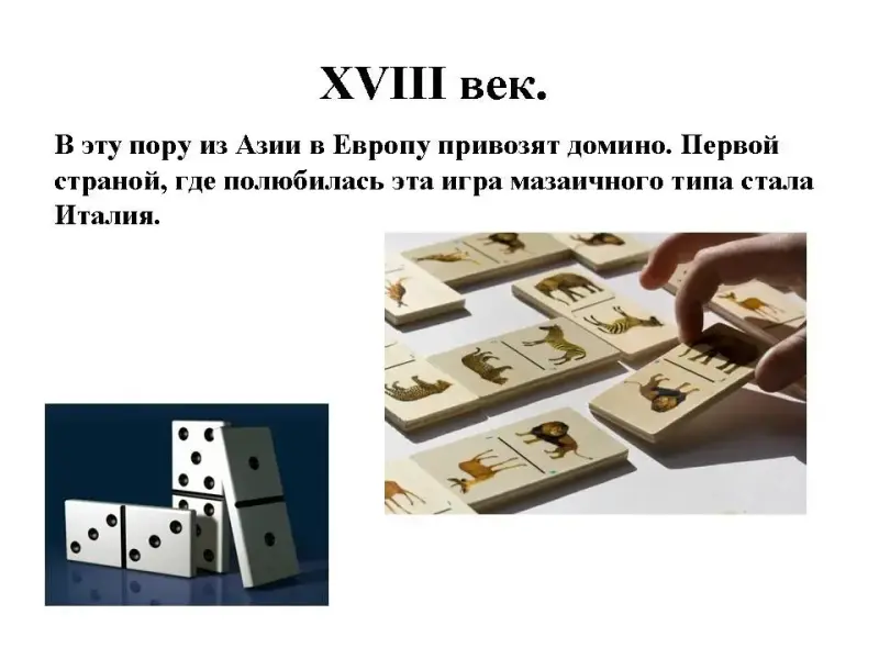 В эту пору из Азии в Европу привозят домино. Первой страной, где полюбилась эта игра мазаичного типа стала Италия.
